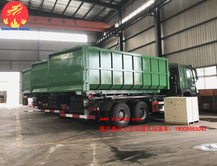 重汽豪沃后雙橋大型勾臂式垃圾車已下線,準(zhǔn)備發(fā)往港口。