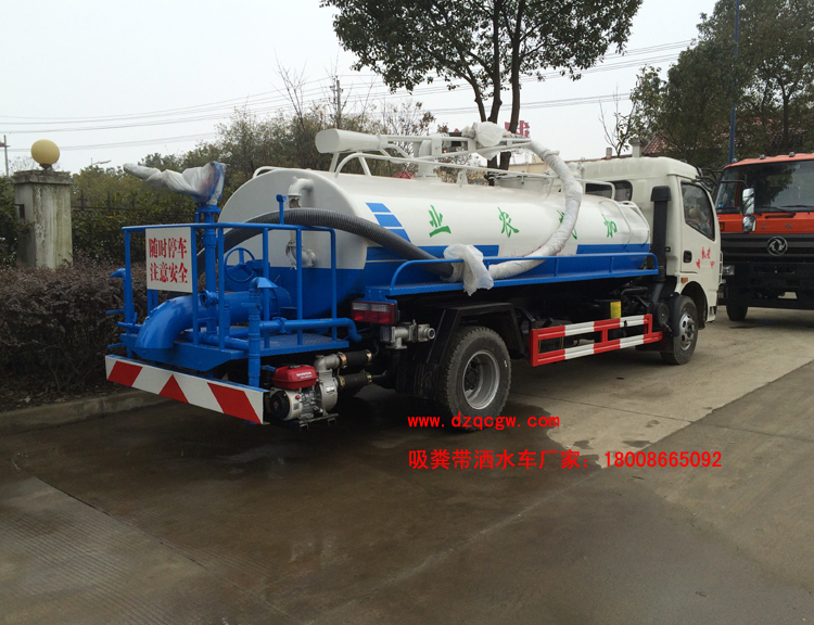 底盤(pán)說(shuō)明:新款單排可前翻白色駕駛室,東風(fēng)5檔變速箱,汽剎制動(dòng),帶原裝方向助力,中冷增壓,7.50R16原廠(chǎng)鋼絲胎.朝柴120馬力柴油發(fā)動(dòng)機(jī),192車(chē)架,軸距3800mm,2.5噸前橋,4.5噸后橋。罐體有效容積:5.5立方。 專(zhuān)用部分:標(biāo)配取力器、隨州真空吸糞泵(8mm以上建議加裝雙聯(lián)真空泵)、油水分離器、四通閥、洗手裝置、罐體后封頭閘閥控制自流口1個(gè)、糞罐、帶視糞窗1個(gè)、1根6米吸糞管、普通油漆。 吸糞管 : 可360度旋轉(zhuǎn),抽滿(mǎn)糞罐時(shí)間:≤5min,吸程:≥6m。自吸自排,壽命長(zhǎng),工作速度快,容量大,運(yùn)輸方便,適用于收集運(yùn)輸糞便、泥漿、原油等液體物質(zhì)。P.S. 可根據(jù)客戶(hù)要求加裝灑水功能,水罐糞罐獨(dú)立分倉(cāng),即可吸糞又可灑水,一車(chē)兩用。加裝水箱或工具箱,加裝液位報(bào)警裝置。 |